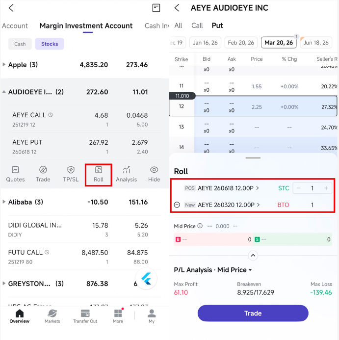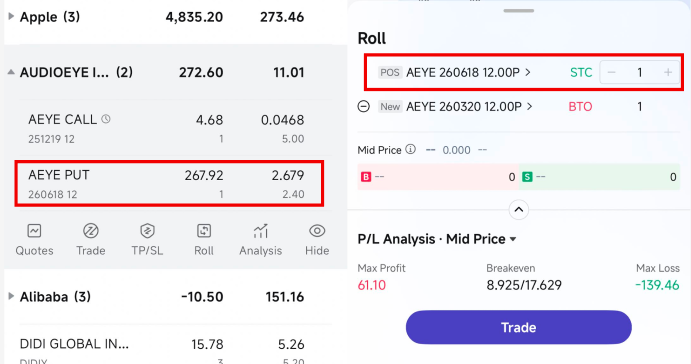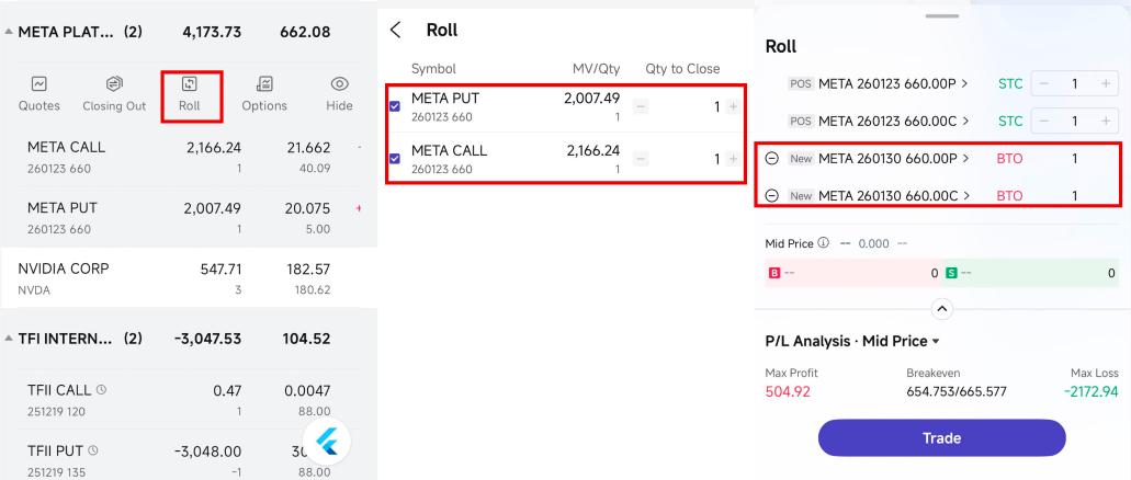 Select the leg(s) you'd like to roll and tap Trade