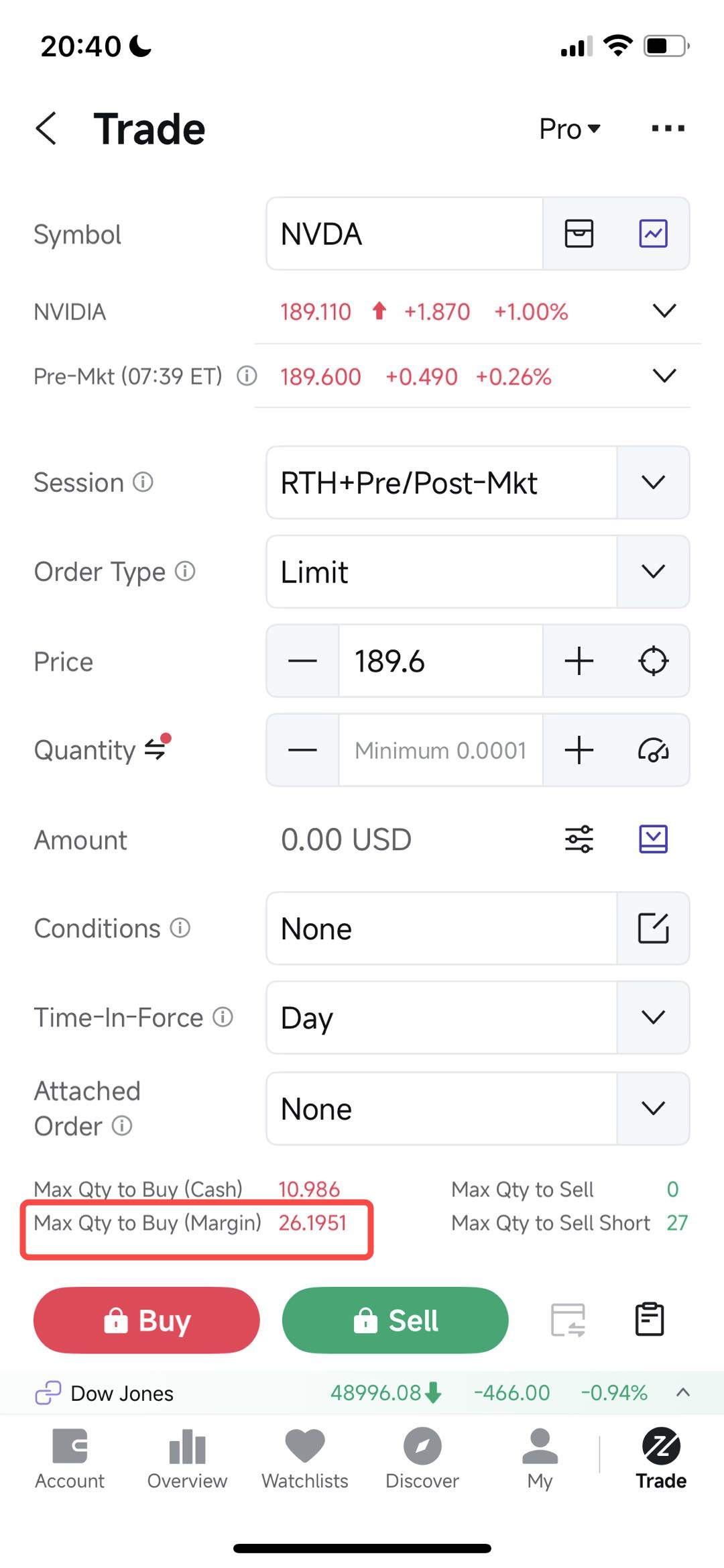 The maximum number of shares you can buy on margin depends on the initial margin of the stock and the asset condition in your account. Each stock may have a different margin. You can see the maximum number of shares you can buy when placing an order, as shown in the following picture: