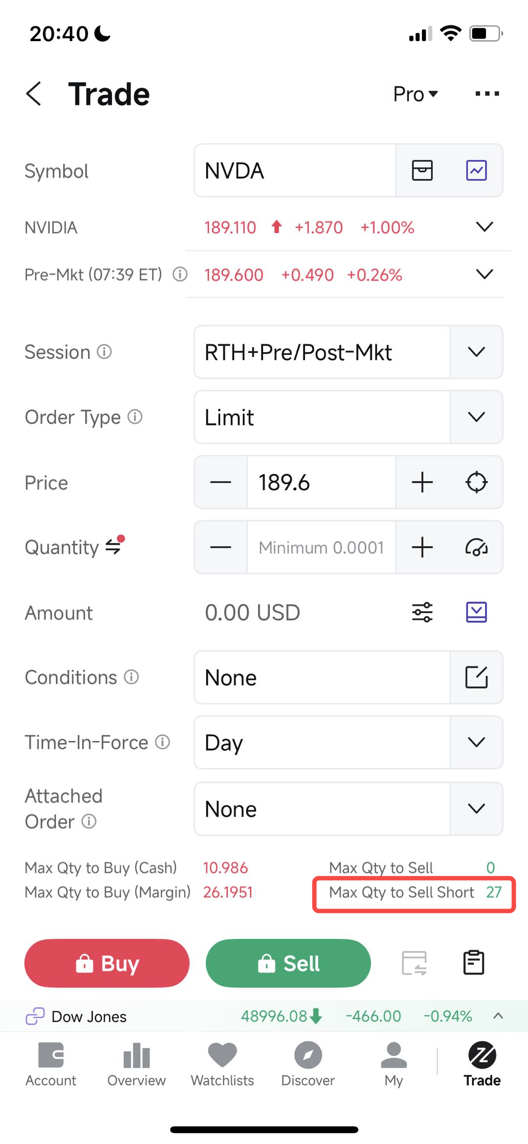 The maximum number of shares you can borrow for short selling also depends on the initial margin of the stock and the asset condition in your account. If you do not have sufficient funds, Airstar will automatically provide you with loans based on the assets (including but not limited to cash, positions, frozen funds, etc.) in your account to maintain sufficient collateral. You can see the maximum number of shares you can sell when placing an order, as shown in the following picture: