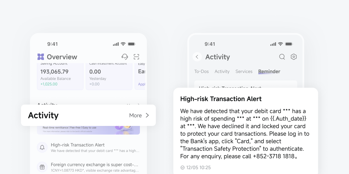 When your transaction triggers our security risk control rules, the transaction will be automatically declined, and you will be notified via App push, email, and SMS immediately to verify the transaction.