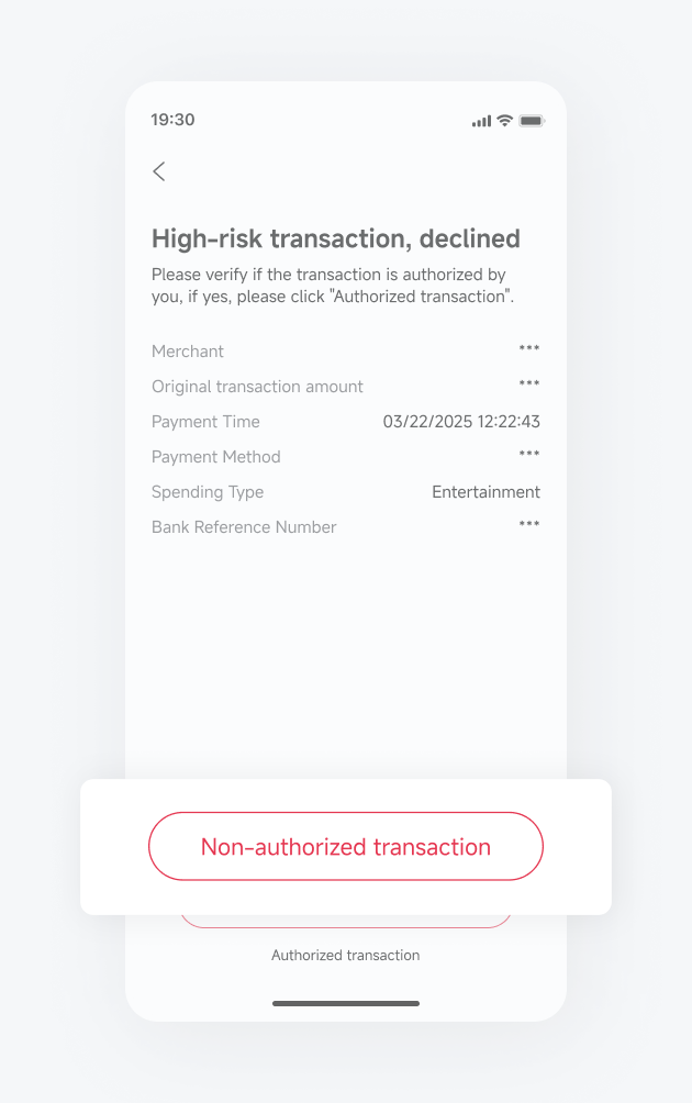 If you confirm that the transaction was not initiated by you, please click the "Non-authorized Transaction" button. We will lock your payment card and guide you to replace it with a new one to ensure the safety of your funds.