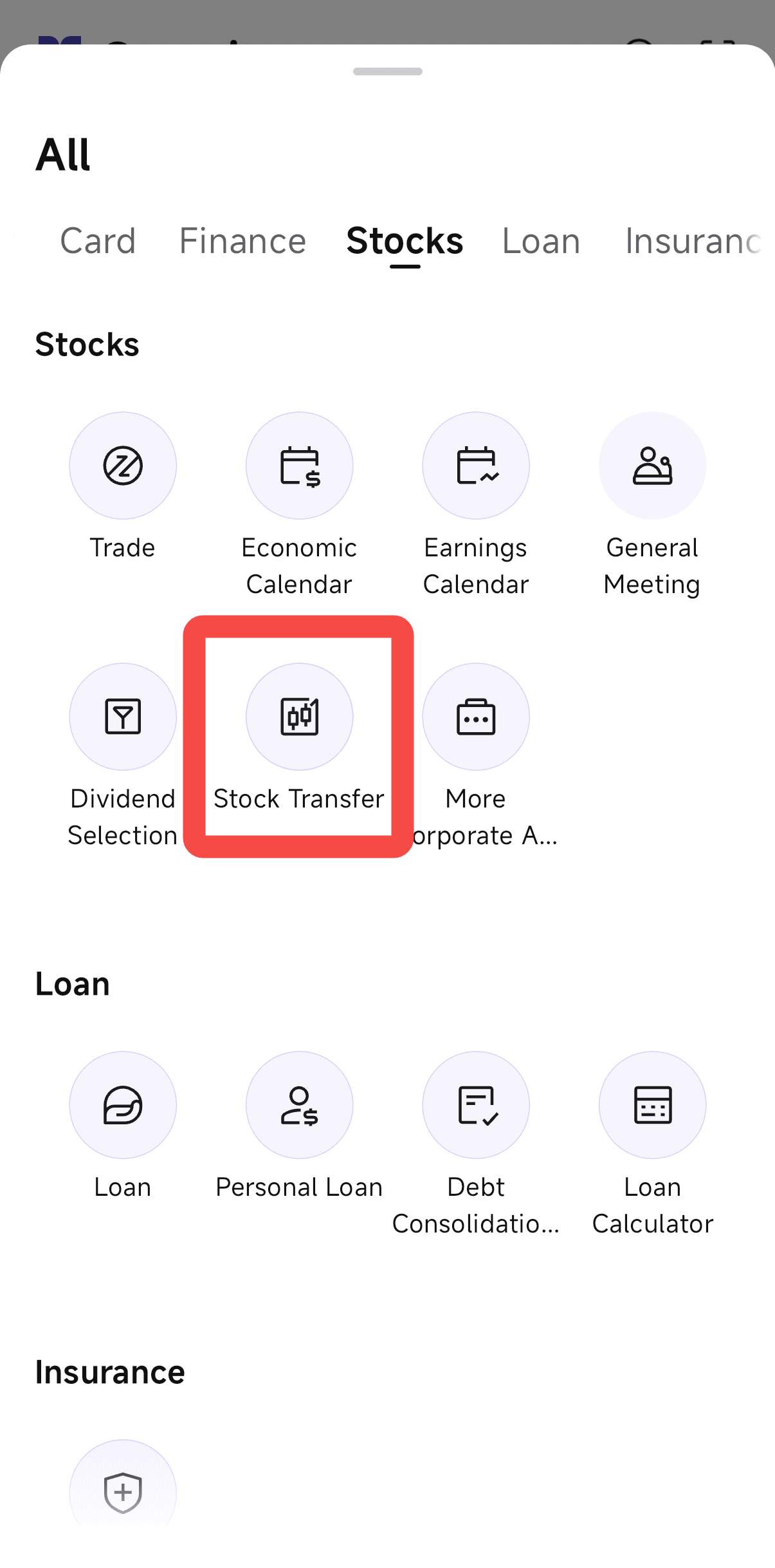 Open the Airstar Bank App and go to Overview > All > Stocks > Stock Transfer.