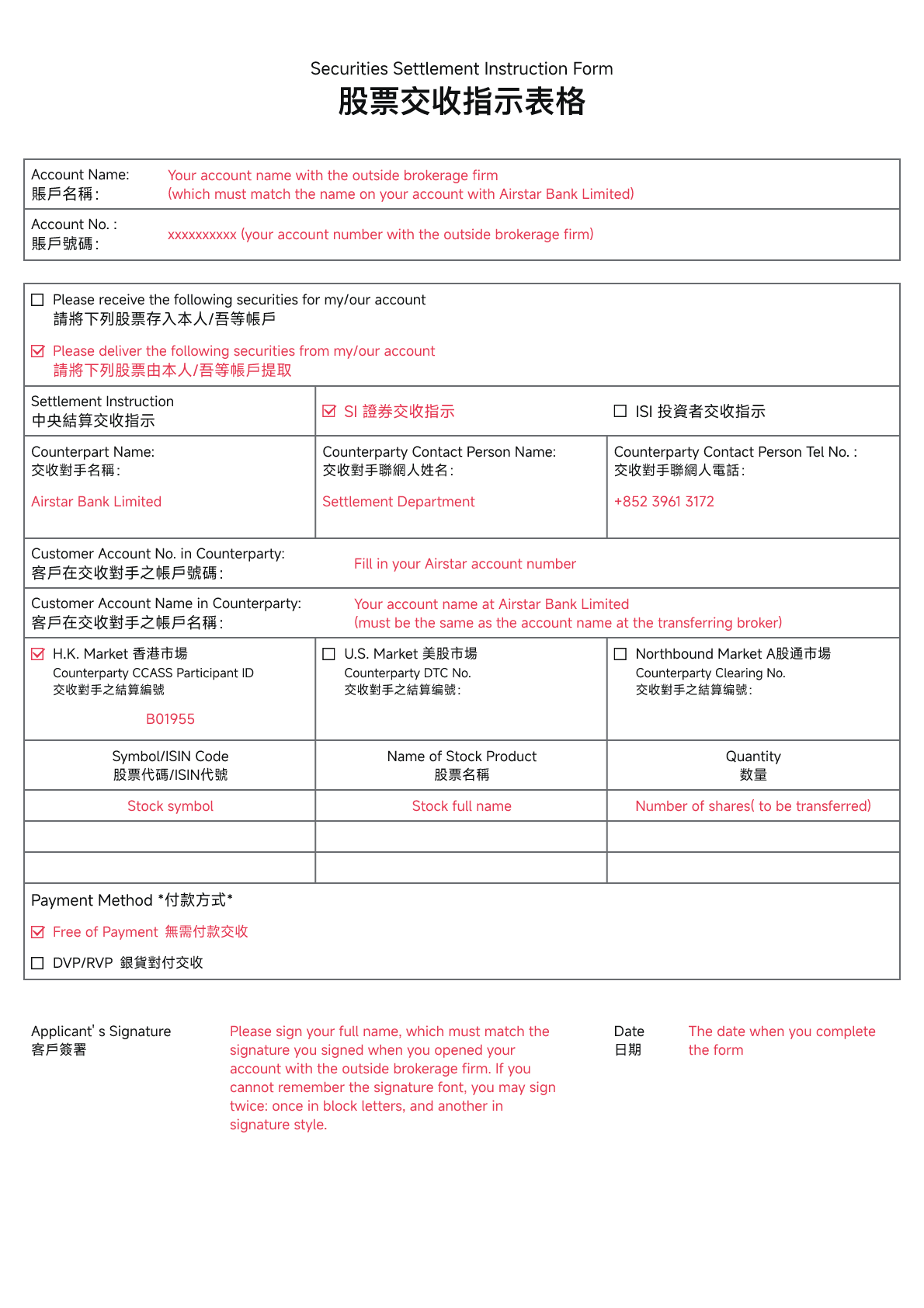 For Airstar Bank's information required to complete the Hong Kong stock transfer form, [click here].