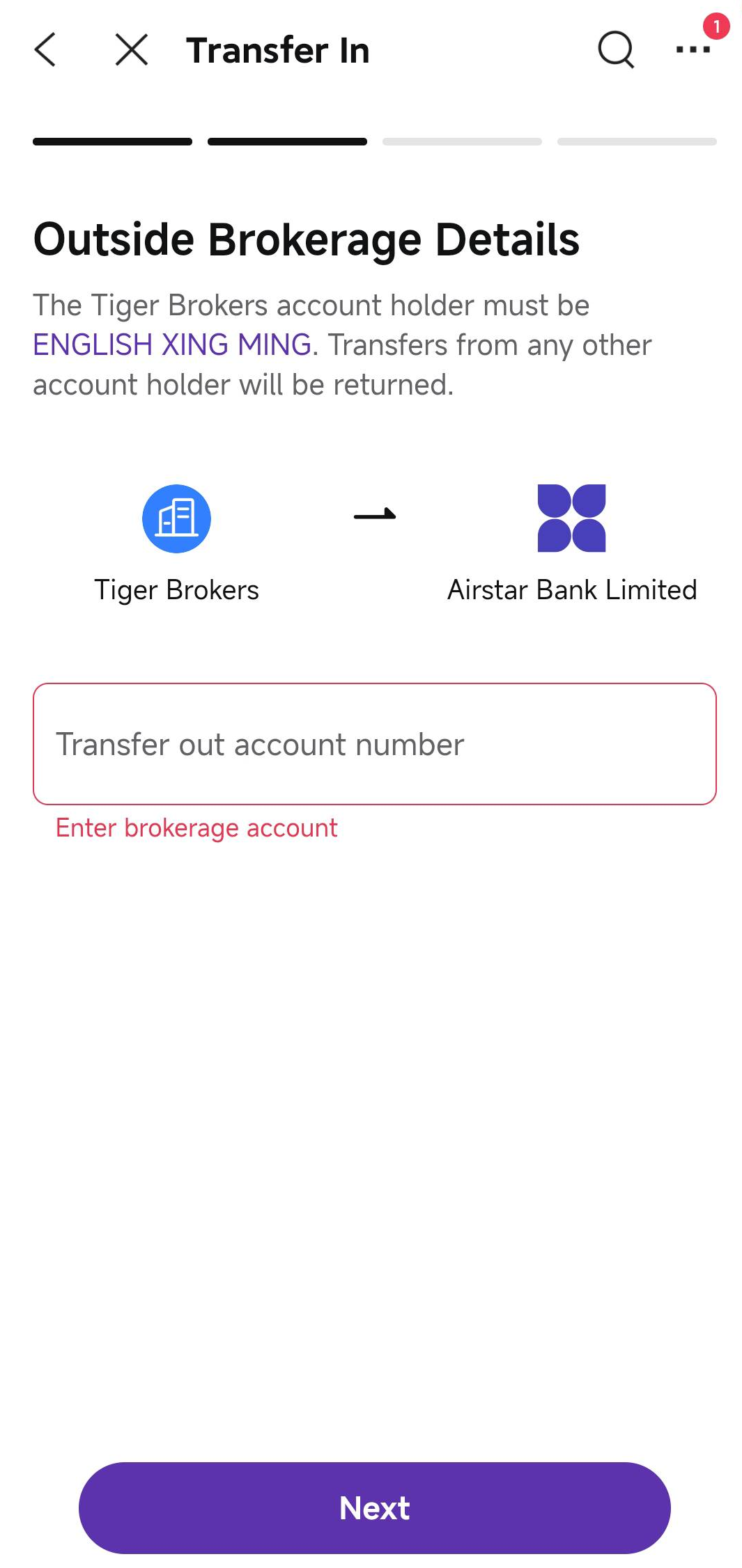 - Your account name at Airstar Bank will be displayed automatically. Please ensure that your name at the current brokerage matches exactly.