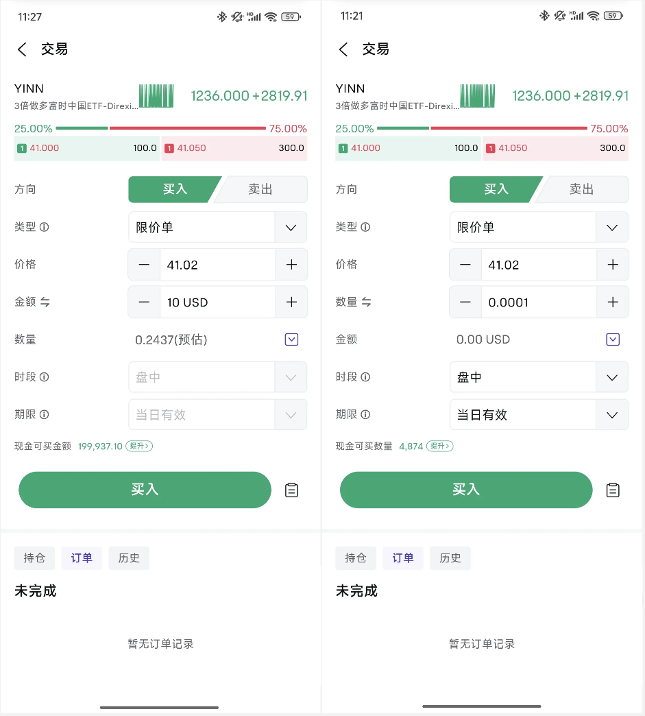 2)对于支持碎股交易的股票,用户可以采用限价单或市价单交易,输入股数或金额即可下单。