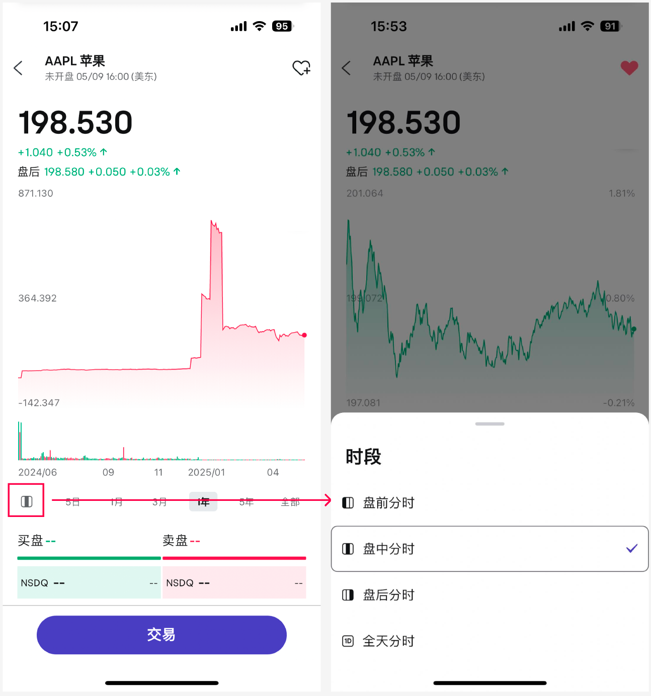 选择“时段”,可查看该股盘前盘后行情: