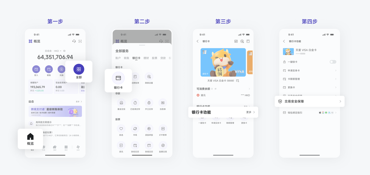 当你收到交易确认通知时,在 App 首页选择「全部」按钮,进入后点击「银行卡」,跳转至银行卡首页;在银行卡首页,依次点击「更多」→「交易安全保障」。