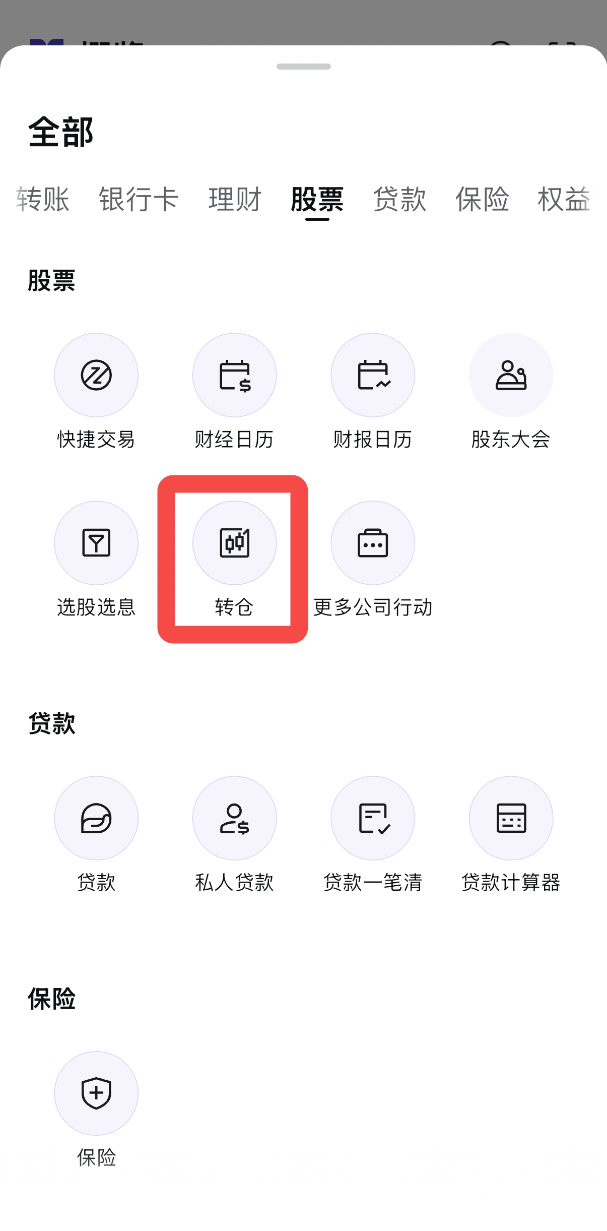 操作路径:「APP > 概览 > 全部 > 股票 > 转仓」