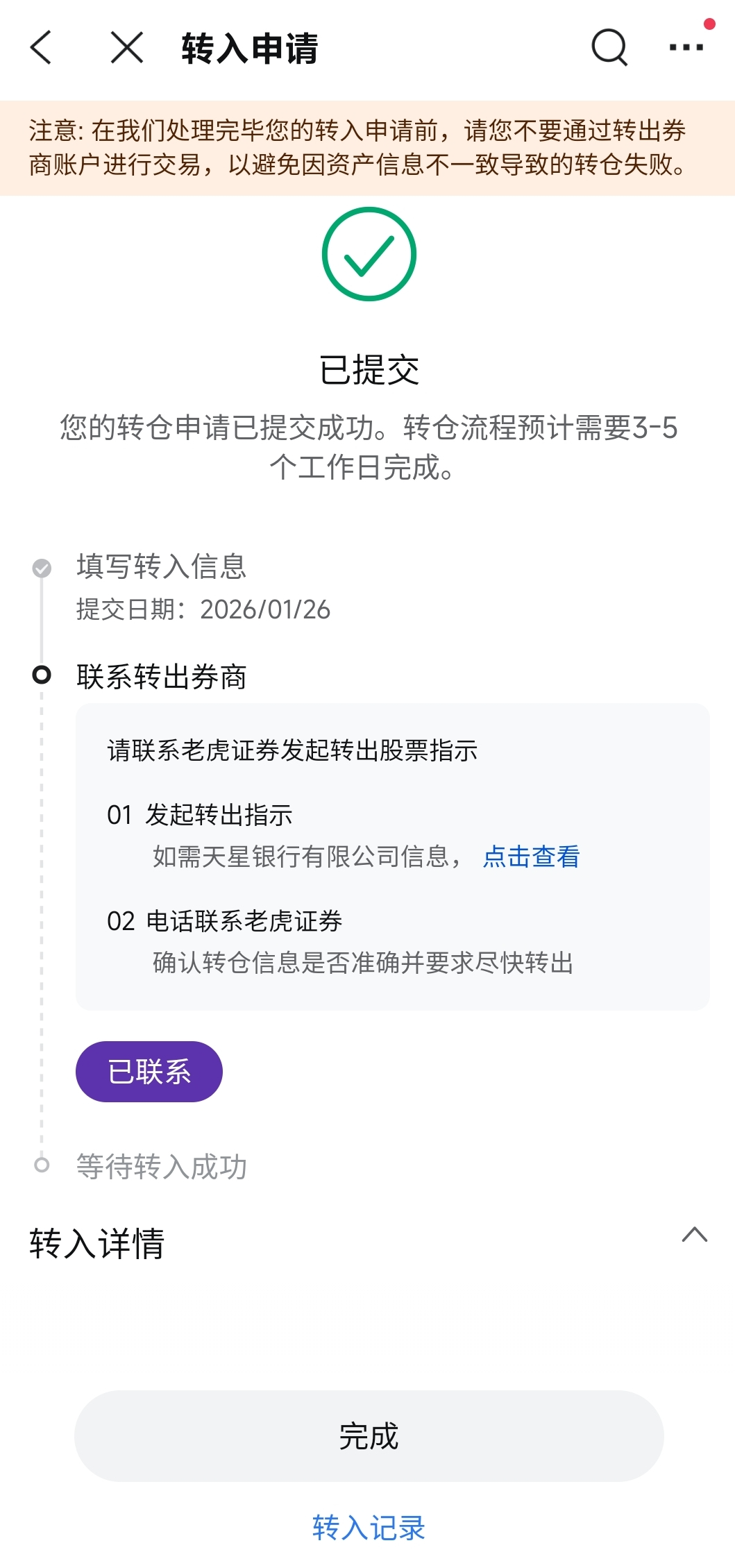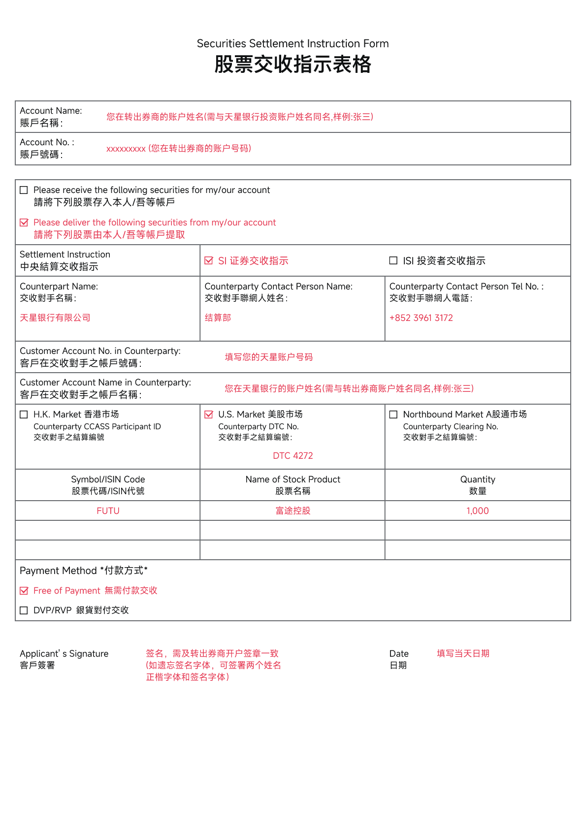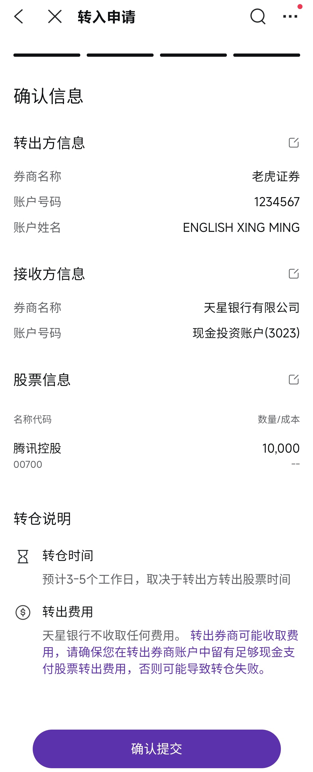 3.转入股票时间:转入港股,一旦对方转出股票,天星将在1-2个工作日存入客户账户;转入美股,需与接收方确认客户身份,转移时间较长预计3-15个工作日(转仓时间仅供参考,以双方实际处理时间为准)。