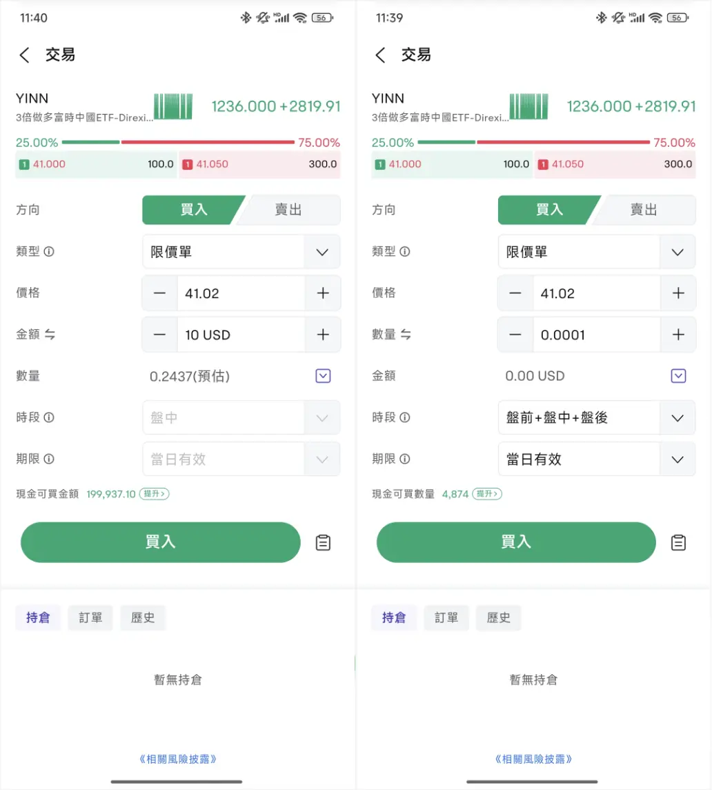 2)對於支持碎股交易的股票,用戶可以採用限價單或市價單交易,輸入股數或金額即可下單。