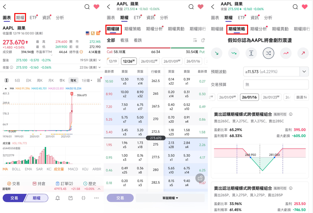 您可通過點擊“自選”股票 > “期權” > “期權鏈” /“期權策略”> 選擇合適策略後點擊交易按鈕下單