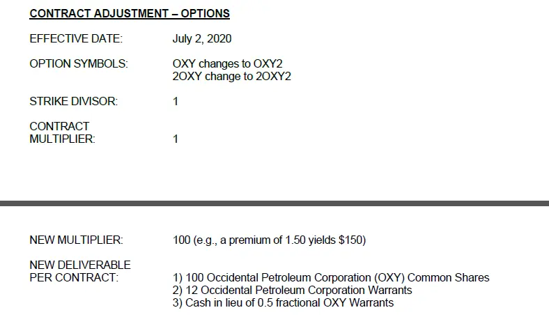舉例來説,OXY 在 2020 年 7 月向持股者派送認購權證,故 OXY 期權合約在 7 月 2 日做出了對應調整: