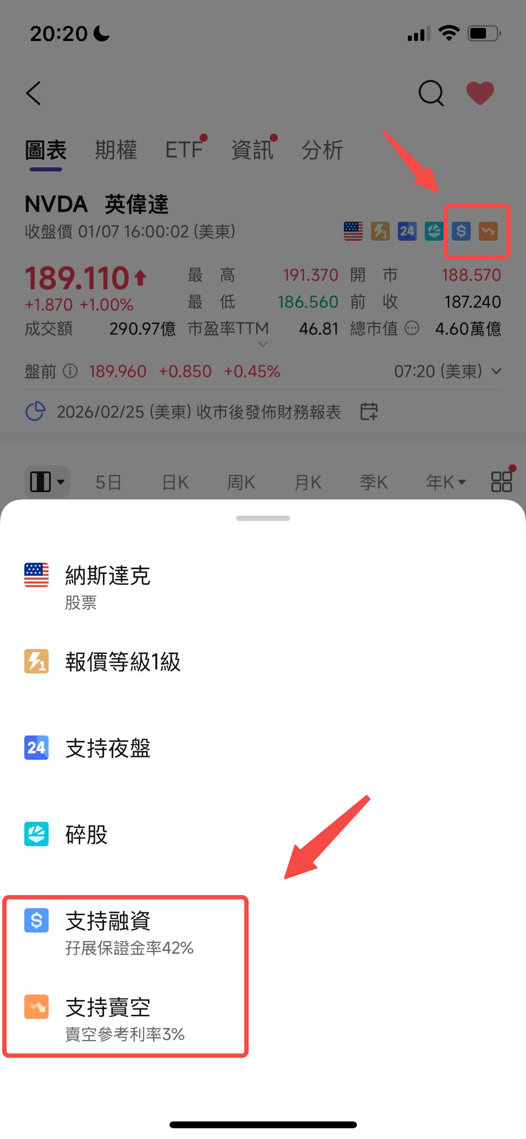 在報價頁面可以查看某隻股票是否支持融資或融券