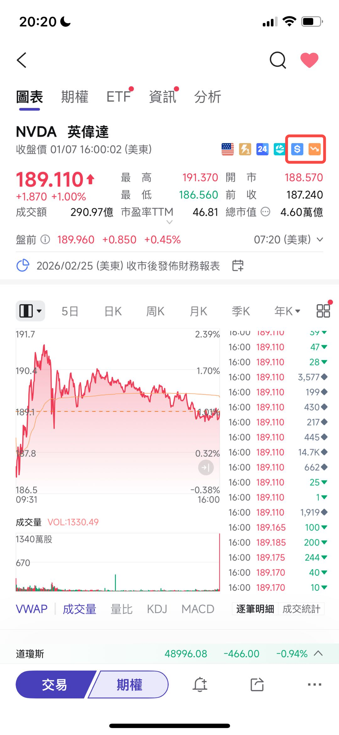 移动端:個股報價詳情頁,查看位於報價右側的圖標。